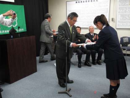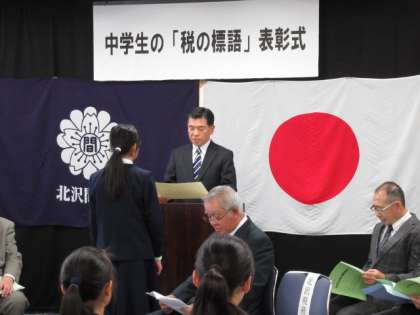 税の標語と税に関する作文の優秀者に対する表彰式が北沢税務署であり、本校からは標語は1年生2名、作文は3年生2名が表彰されました。今年は税金の使い方を考える作品が目立ったということでした。