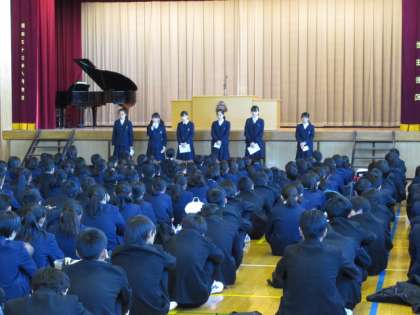 12月25日(月)は、今学期最後の登校日です。午前中に教室で通知表を渡し、午後は体育館で終業式を行いました。式後には、文化部より6名の3年生が活動報告と、後輩への応援メッセージを送りました。1、2年生の代表生徒からは感謝の言葉がありました。約4か月の2学期は、多くの取り組みがあり、各自が成果を上げることができました。華道部の生徒が正月の花を活けて、校長室に飾ってくれています。