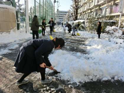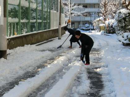 1月22日(月)は夜まで雪が降り続き、学校周辺も20cmぐらいの積雪となりました。一夜があけ、一面は銀世界。この日はいつもより早く登校する生徒が何名もいました。他の生徒が来る前に雪かきをするためにです。ボランティア活動の神髄です。