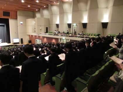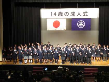 今年度の「14歳の成人式」が、2月3日(土)に世田谷区民会館で行われ、本校からは19名の1年生が参加しました。区立中学校の生徒会役員の集まりである「生徒会サミット」が企画と運営を担い、本校の生徒会役員2名が発表を行いました。3ブロックのテーマは、「清廉潔白〜ネット社会での人への思いやり〜」で、今日的な課題について考える機会になりました。