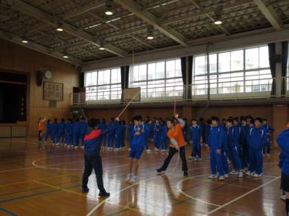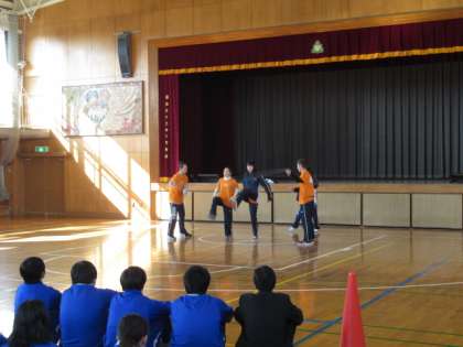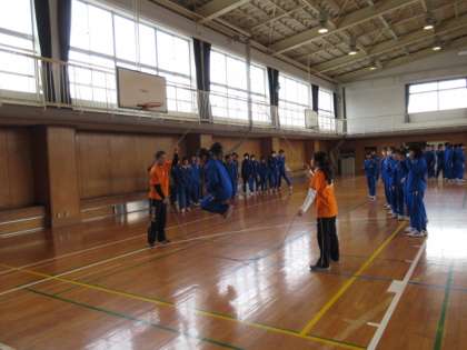 今年度のオリンピック・パラリンピック学習の一つとして、日本体育大学の協力を受け、ダブルダッチ体験をしました。軽快なパフォーマンスを見学した後は、二本の縄を跳ぶことにことに挑戦しました。