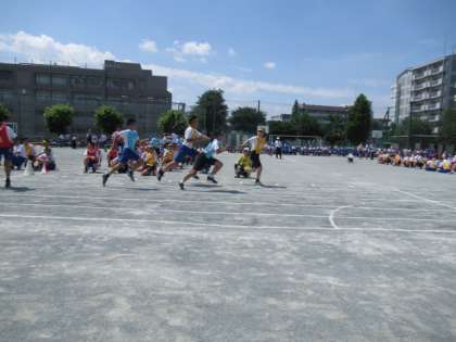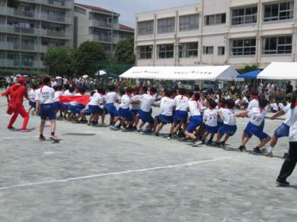 体育大会は午前中のプログラムが終わりました。本年度の体育大会スローガンにある「燃え上がれ 熱い思い」を展開しています。