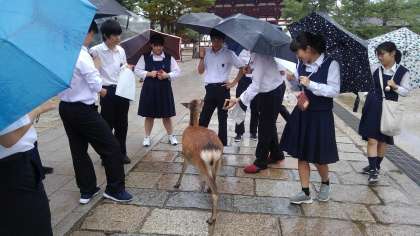 奈良公園は班行動です。恐る恐る鹿に鹿せんべいを食べさせたり、大仏殿を巡ったりして過ごしました。ほぼ日没とともに、宿舎の花楽に入りました。