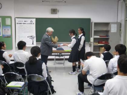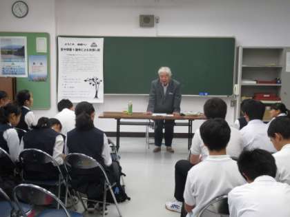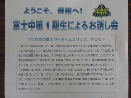 11月に本校は創立70周年行事を行います。9月27日の放課後に、本校第1期生(昭和23年入学)の吉田圀𠮷さんをお招きして、当時の様子をを聞く会を行いました。約30名の生徒が参加し、保護者の方々も来ていただきました。お話の最後には、吉田さんから富士中生へのメッセージも伝えていただきました。