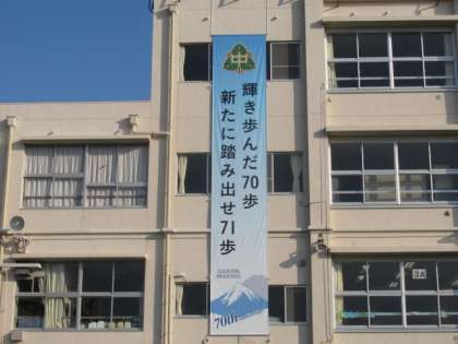 11月13日(火)は、本校の開校記念日です。創立70周年を迎える本年度は、この日に合わせ、校舎に大きな懸垂幕を掲げました。幕には、「輝き歩んだ70歩 新たに踏み出せ71歩」の生徒スローガンと、生徒がデザインした富士山が描かれています。70周年記念誌も完成し、開校記念日に生徒に配布します。