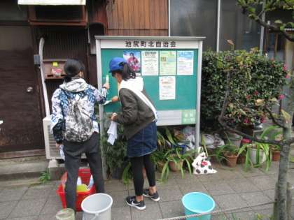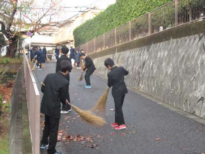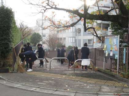 12月2日(日)は,池尻・三宿のクリーンデーでした。本校生徒が落書き消しや国道246沿いの清掃を行いました。この日は、期末考査を終えた3年生も4名参加しました。12月7日は、2年生が学校周辺の落ち葉掃きをしました。連日の風と雨で散った落ち葉を一生懸命にほうきで掃いていました。