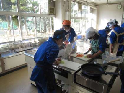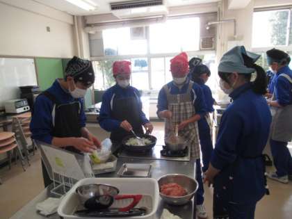 1年生は家庭科の授業で調理実習を行いました。献立はハンバーグとにんじんのバター煮です。中学校に入ってから初めての調理実習を、いつもと違い2時間続きの授業で行いました。