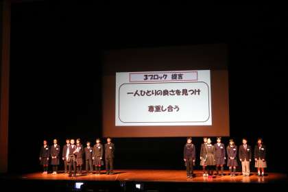 2月3日(土)第13回「14歳の成人式」が世田谷区民会館ホールで開催されました。本校生徒会会長と副会長はそれぞれ総合司会や開会宣言を務めた他、3ブロックの発表でも富士中での実践を堂々と報告し、リーダーとしての職責を果たすことができました。また、会場に集まった多くの1年生の参加態度も非常に立派でした。「言われて嬉しかった言葉」について発表をした他ブロックの生徒からの突然の場内インタビューに、『ありがとう。です!』と即座に答えたTさん。とっても爽やかでした。