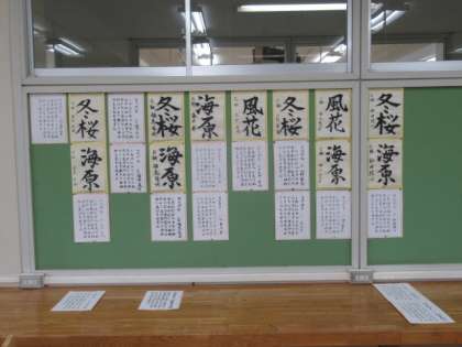2年生の階には、9月に行った職場体験新聞と「教科日本語」のレポートが展示されています。「教科日本語」のレポートは、切り口や展開がさまざまで、それぞれの作品に面白さがあります。技術室には書写(毛筆」の作品を展示しています。