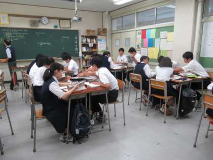 7月2日(水)は、先生たちの校内研修会の日でした。5校時は3年生だけが残り、家庭科、体育、社会の研究授業を行いました。今年度は生徒の「考える力」「表現する力」をどう伸ばしていくかがテーマです。