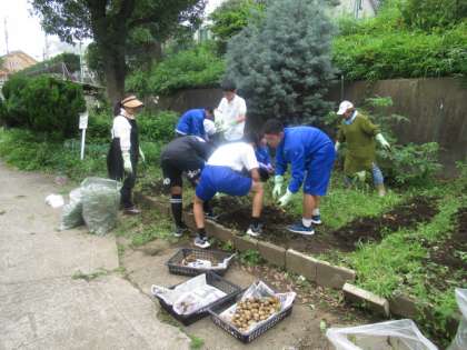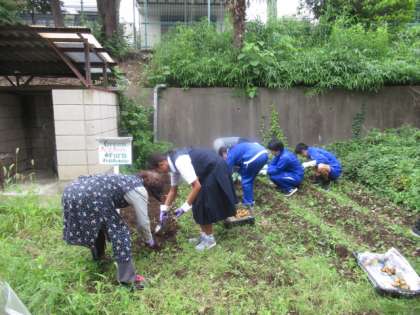 7月8日(月)の放課後は、学校で育てたジャガイモを収穫するボランティアに10数名が参加しました。地域の方と一緒に掘り出したジャガイモを、10日は収穫祭として、参加したボランティアみんなでおいしくいただきます。