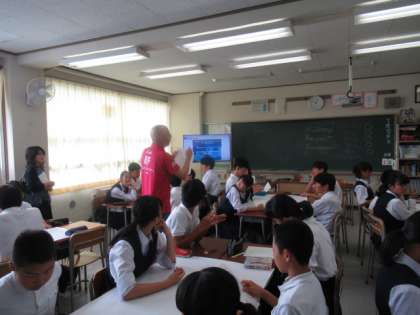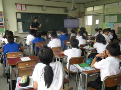 7月10日(水)は、「英語でオリンピック精神を学ぼう」という学習をしました。2人のアメリカ人のゲストティーチャーを招き、オリンピックの価値を確認した後、班でオリジナルのシンボルマークの作製に取り組みました。