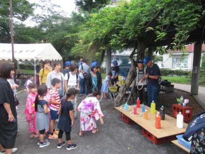 夏休み前最後の土曜日は、多聞子どもまつりと下代田東町会のお祭りがあり、ボランティアキャップをかぶった生徒たちが活躍しました。小雨が降り始めたため、吹奏楽部のオープニングは急きょ、本校体育館に場所を変更しましたが、多くの方々が聞きに来てくださいました。
