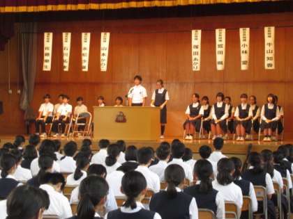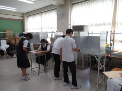 9月20日(金)は、生徒会役員選挙の立会演説会と投票が行われました。8名の立候補者と8名の応援演説者は皆、堂々とした立派は発表ができていました。3年生の投票は、実際の選挙で使う投票台を用意し、本物そっくりに行いました。