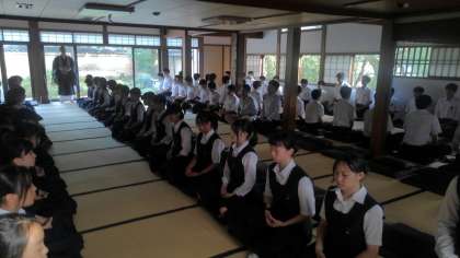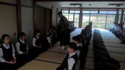 午後4時に、全員が建仁寺に集まりました。ここでは座禅体験です。15分ずつ2回、座禅を組み、体と呼吸と心を整えました。
