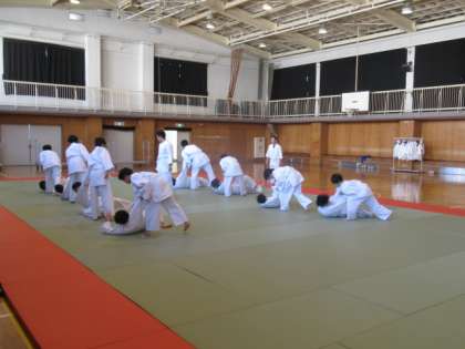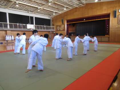 男子は体育の授業で柔道が始まっています。1校時のクラスは畳の準備から始めます。1年生にとっては、初めての武道の授業です。柔道着を着て組手や受け身の練習をしていました。