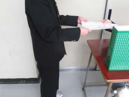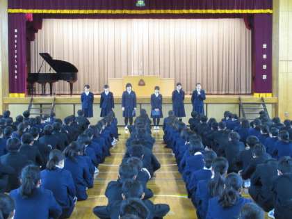 終業式の前の時間は、どの学年も学年集会を開き、学級委員を中心に、2学期のまとめと新年に向けた発表をしていました。終業式後は、文化部3年生代表からの活動報告を行い、それに応える2年生からのお礼の言葉もありました。4校時は教室に戻り、一人一人が通知表を受け取り、2学期を終えました。