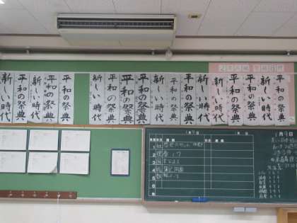 新学期が始まりました。1校時は始業式を行い、午後は国語係が宿題の書き初めを教室に掲示しました。3学期の始めにふさわしい風景になりました。