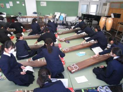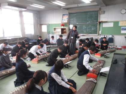 2年生は音楽の学習で和楽器の練習をしています。音楽室に畳を敷き、「荒城の月」を琴の調べにのせて演奏していました