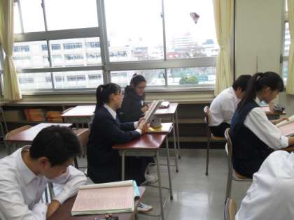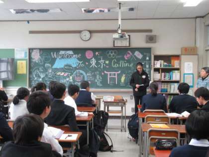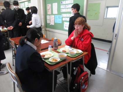 国際交流事業でカナダ ウィニペグ市から2人の中学生が来ました。2年生の学級に入り、約10日間滞在します。自己紹介では2人も上手に日本語を使っていました。今日は一緒に給食を食べたり、授業に参加したりしました。