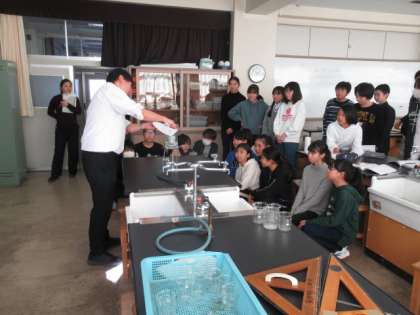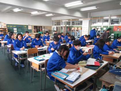 毎学期、授業に関する校内研修会を実施しています。3学期は1年生のみ5校時まで授業を行い、理科、美術、英語の授業を通した研修をしました。服装を考える日でもあったので、いつもと少しだけ違う雰囲気がありました。