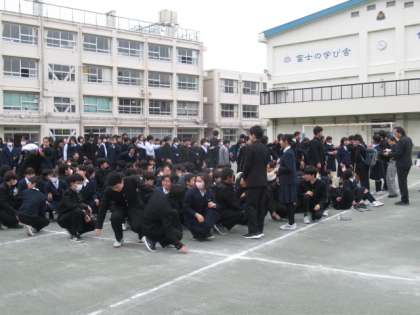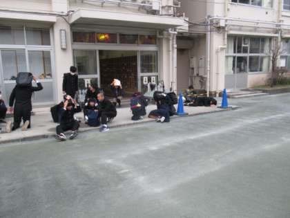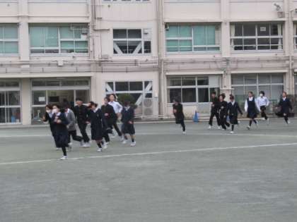 2月の避難訓練は、登校時の地震発生を想定して行いました。8時20分に放送を流し、それぞれがいる場所で身を守った後に、校庭に集まりました。