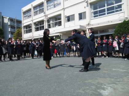 簡素化された卒業式でしたが、全員が堂々と巣立っていきました。お世話になった先生へのサプライズもあり、最後は保護者と職員が作ったアーチをくぐっての卒業でした。