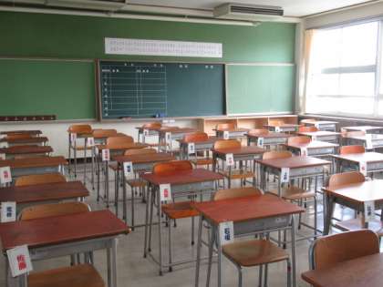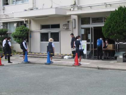 校舎外での登校は、今日が最後です。来週から学年別の分散登校が始まります。1年生の教室は、後ろに巻紙が、座席には名前が貼ってあり、教室で生徒を迎える準備が整いました。