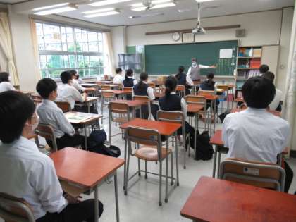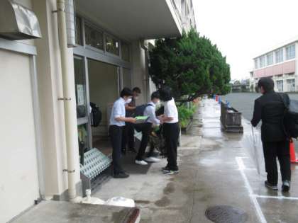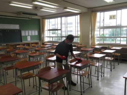6月になり、分散登校が始まりました。学校の1日は、使用する教室を主事が消毒をし、教員が換気をするところから始まります。登校時には学年昇降口で健康カードを確認してから教室に入ります。分散登校中は、座席を一人分ずつあけて座ります。