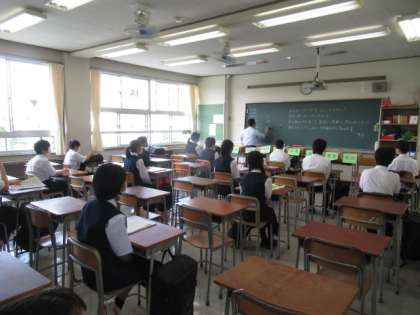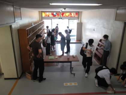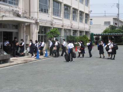 分散登校3日目は、1年生の登校日です。初めて校舎に入り、4階の教室で学活を行いました。