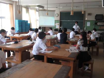 技術・家庭科は、共に新しい先生の授業です。2年生の技術は、エネルギー資源の勉強をしていました。3年生の家庭科は、2学期に行う保育の話に生徒は目を輝かせていました。