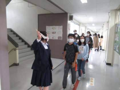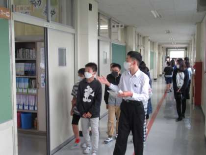 富士の学び舎の小中交流事業として、3小学校の6年生を迎えました。本校2年生が校内を案内し、わかりやすくに富士中の紹介をしていました。今年度は本校保護者の協力を得て、小学生の希望保護者にガイドツアーを行いました。参加した方々からはとてもよい評価をいただいています。