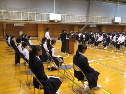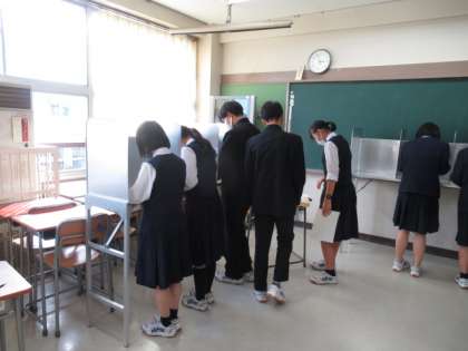 新生徒会役員を決める立会演説会と投票を行いました。立候補者と応援演説者は皆、堂々と力強い演説をし、頼もしさを感じました。聞いている側の生徒たちも演説者をしっかりと見つめ、真剣な態度で耳を傾けている姿が、今の富士中をよく表していると思いました。3年生の投票は例年通り、区選挙管理委員会から実際の投票用紙記入台と投票箱を借り、疑似選挙体験をしました。