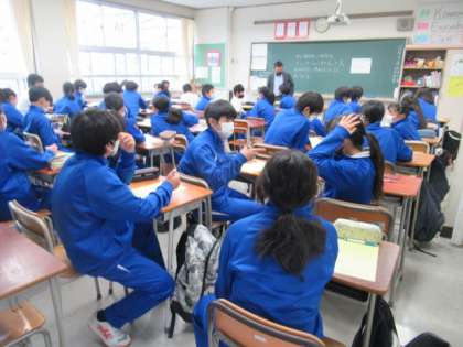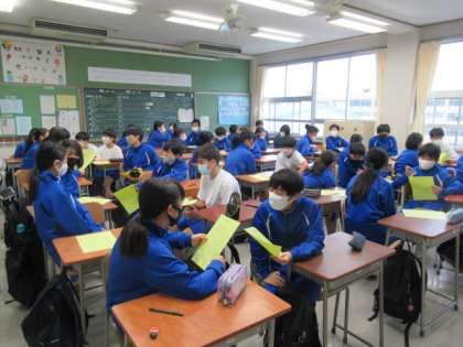 1年生の朝学習の時間にコミュニケーションタイムを設け、実施しています。毎週木曜日、3学期末まで続きます。「工夫して話す」「相手の意図を考えて聞く」「対話によって自分の考えを深める」のがねらいです。今日は「好きな季節」について、隣の人と話をしていました。
