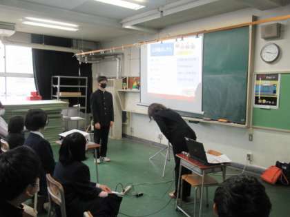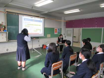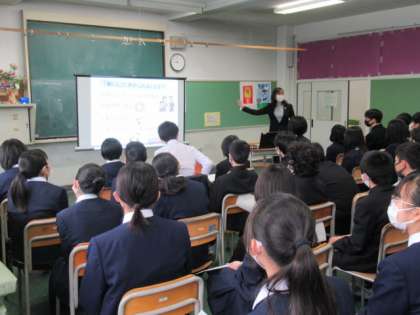 2年生のキャリア学習で、ビジネスマナー講座を行いました。キャリアコンサルタントの方に講師をお願いし、コミュニケーション力を高めたり、電話対応の仕方を学んだりしました。社会につながる実力を付けようとする1コマです。