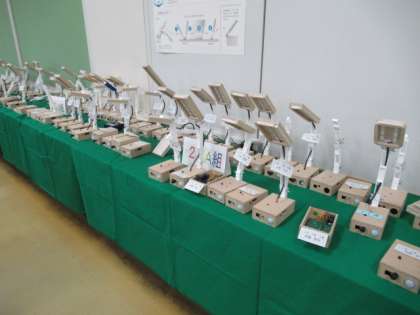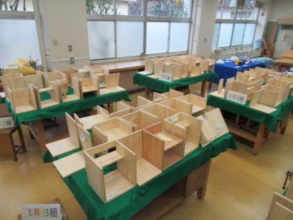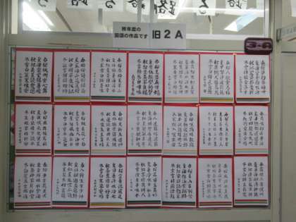 木工室には1、2年生の技術科の作品が並んでいます。1年生は木材で「収納プロデューサー」を製作しました。2年生の作品は{LEDスタンドライト」です。3年生の廊下には、昨年度の書写の時間に書いた、「自分の春夏秋冬」を漢詩にした作品を展示しています。