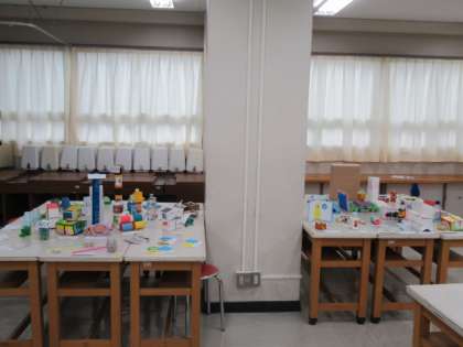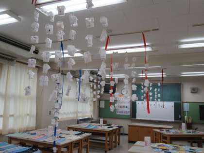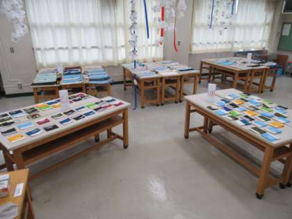 被服室では、家庭科の作品を、空間を利用して展示しています。1、2年生は裁縫の作品を、3年生は保育の学習での作品を見ることができます。作品展は明日が最終日です。