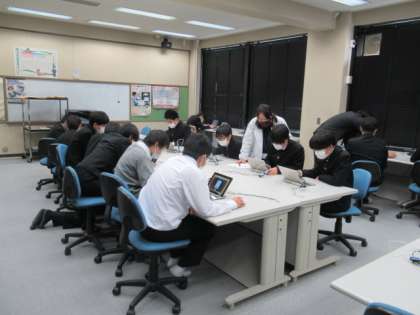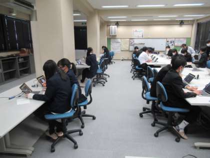 2年生がパソコン室のタブレットを使って、数学の課題に取り組んでいます。今年度途中から区が導入したロイロノートの使い方にも、だいぶ慣れてきたようです。