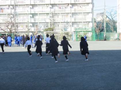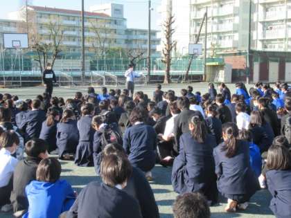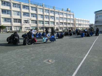 2月の避難訓練は、登校時の地震を想定して実施しました。登校中の生徒は校庭の中央に集まり、登校を済ませている生徒は、揺れが収まったとの放送の後、校舎から校庭に避難しました。副校長から「登校中は最も安全な場所を自分なりに判断して、自分の身を守ることが重要だ。」と話がありました。先週土曜日には東京でも震度4の地震があり、生徒は緊張感をもって訓練ができました。