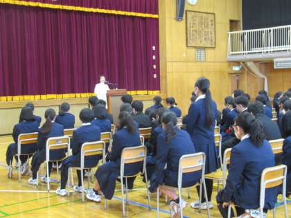 3年生の4校時は奉仕活動でした。3年廊下の壁をきれいにしたり、昇降口を掃除したりしました。5校時は、NHK元アナウンサー 山根 基世さんをお招きして、卒業記念講演会を行いました。将来に必要なことを、激励を込めて話していただきました。