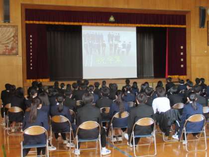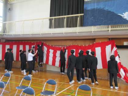 明日は第71回卒業式です。3年生は最後の卒業式練習をしました、練習後は3年生へのサプライズで、在校生からのおめでとう動画を披露しました。1、2年生の各クラスや各部からの心のこもった動画に、3年生の顔は最高にうれしそうでした。午後は在校生の代表となる2年生が会場作りをしました。