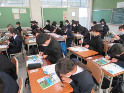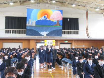 緊張の中、元気で気持ちのよいあいさつで、1年生の1日が始まりました。午前中は小学生の時とは比べものにならない厚さの教科書を受け取り、丁寧に名前を書いていました。午後は、生徒会主催の新入生歓迎会でした。上級生全員と初めて対面し、最後は先輩たちからお祝いに鉢植えが各クラスに贈られました。