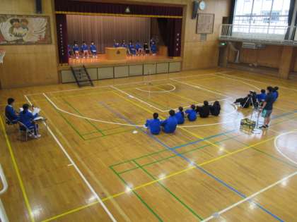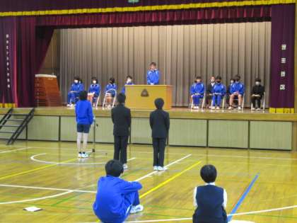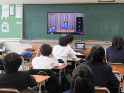 今年度の生徒総会はオンラインを用いて行いました。体育館に集まったのは、発表者と質問・意見を述べる生徒、司会生徒だけです。各教室で発表と質疑応答を聞く生徒総会になりました。発表者の堂々とした話しっぷりが立派でした。