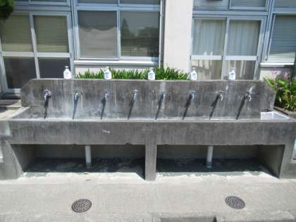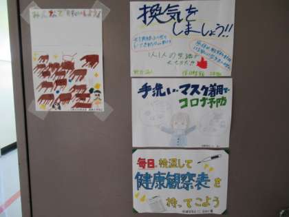 体育大会まで校庭での練習が続きます。校庭の水道には泡石鹸を備え、練習前と練習後の手洗いの徹底を指導しています。校内のポスターにある「一人ひとりの意識が大切!」の文字が目を引きます。