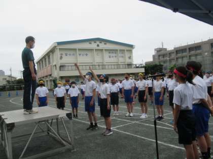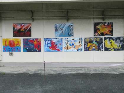 クラス模造紙に見守られ、体育大会が始まりました。気持ちのこもった選手宣誓の後の準備運動は、最初の演技です。