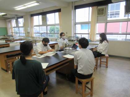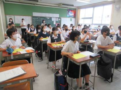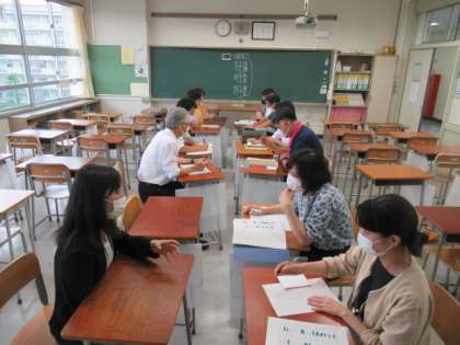 富士の学び舎の小中交流会を本校で行いました。小学校の先生方が全学級の授業の様子を参観し、教科ごとに話し合いの時間をもちました。教科の話し合いの後は、旧6年生の担任の先生と本校1学年の教員が、より滑らかな中学校への接続が実現するよう、生徒の様子を伝え合っていました。