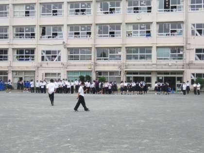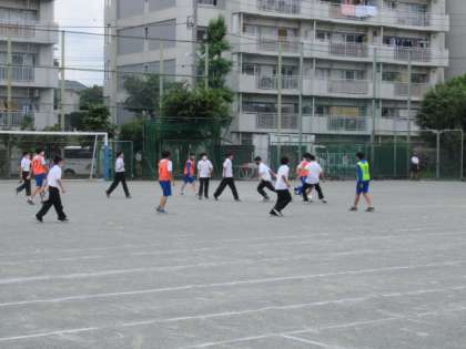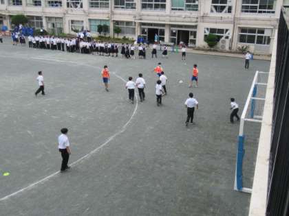 今週は校庭で男子のサッカー大会が始まりました。体育館での女子ドッジボール大会に続いて、生徒会が企画・進行しているレクリエーションです。校舎の窓からも声援が飛んでいます。楽しい学校生活のために生徒会役員が大活躍しています。