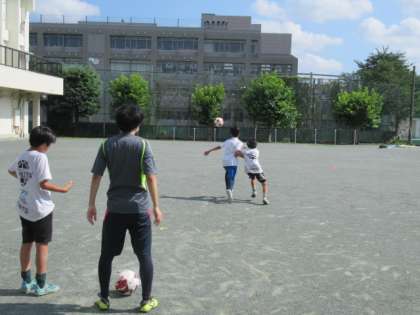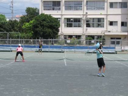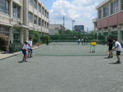 校庭ではサッカー部と男女テニス部が練習をしています。短い間隔で休憩時間を設け、水分を十分にとりながら夏の練習を頑張っています。