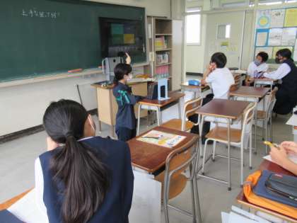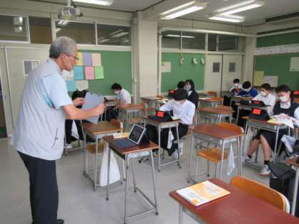 美術の授業は、鑑賞のプリントをタブレットで共有しながら、教室と自宅と同一内容で授業を進めていました。国語の意見文を書こうの授業では、教室で生徒が文章を書いている時間を利用して、自宅で学習している生徒にプリントを見せながら、より丁寧な説明をして授業を行っていました。