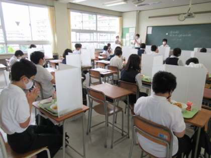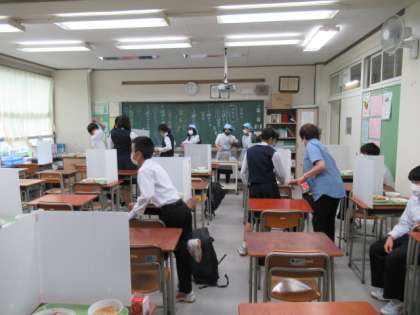 教室の人数が半分なので、当番以外の生徒の力を借りて支度をしているクラスもあります。さすがに準備があっという間に終わります。食べる時は周囲の机が1つ空いた場所でパーテーションを置いて・・・静かすぎる感が拭えない給食風景です。